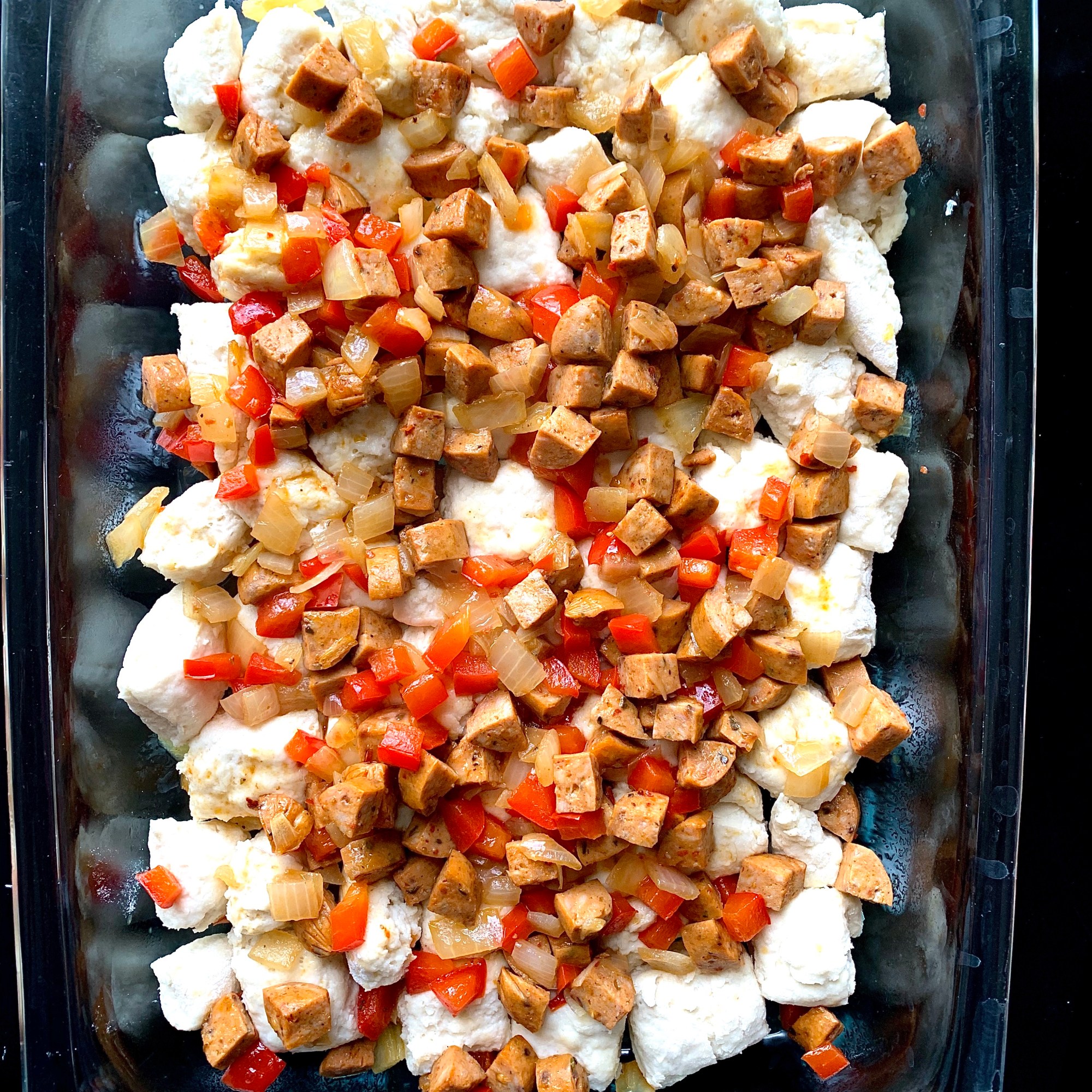 - Turn on the stove to medium high heat and brown the sausage along with the bell peppers and onion together.
