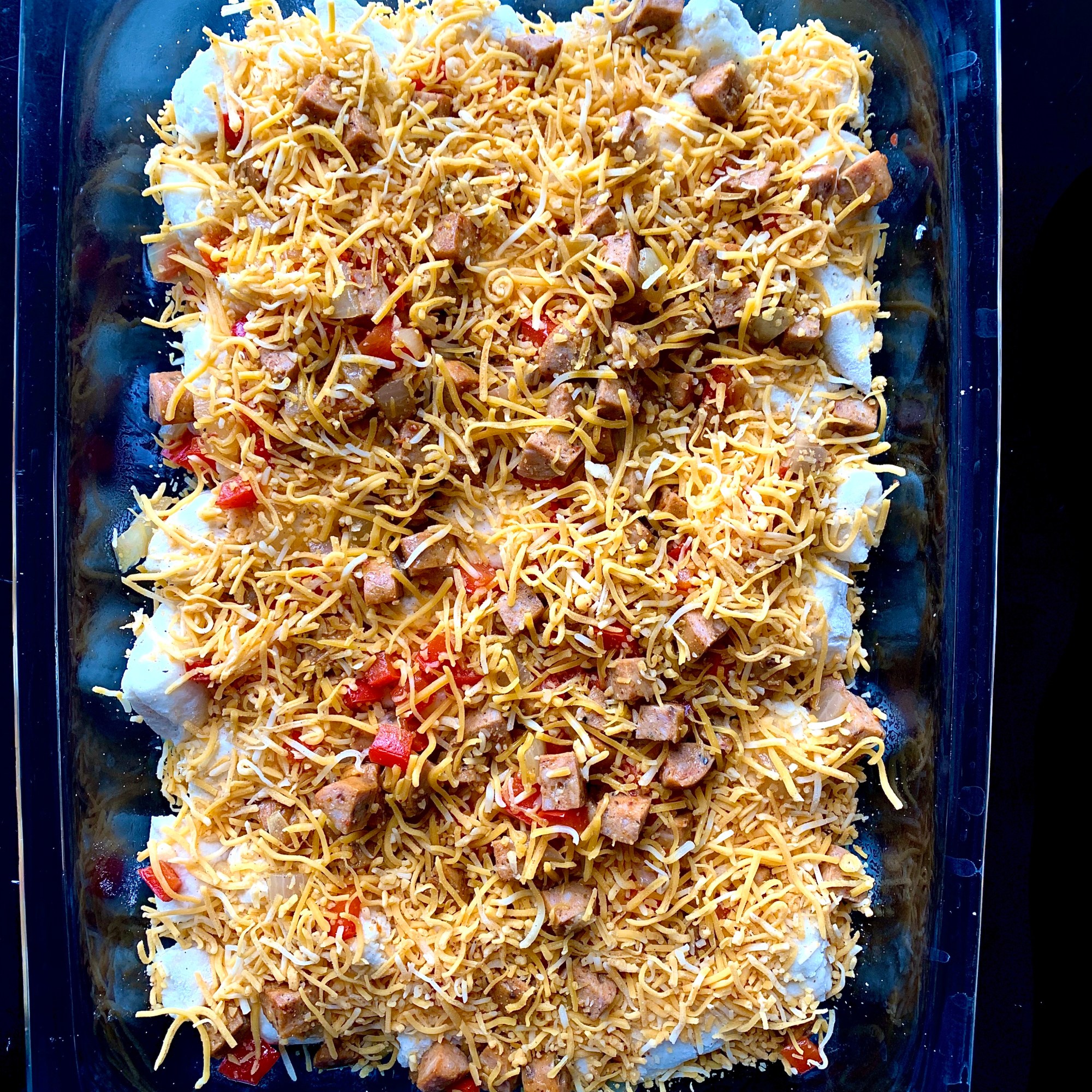 The meat pictured is chorizo chicken sausage which adds a nice flavor. I generally go for any flavored chicken sausage so I don’t have to add many seasonings but recently I’ve been adding salsa or siracha to the eggs before cooking and that really elevates the flavor. This dish will not disappoint and can probably be made in a crockpot too. It is also versatile as many substitutions can be made which is the name of the game in this quarantine season.