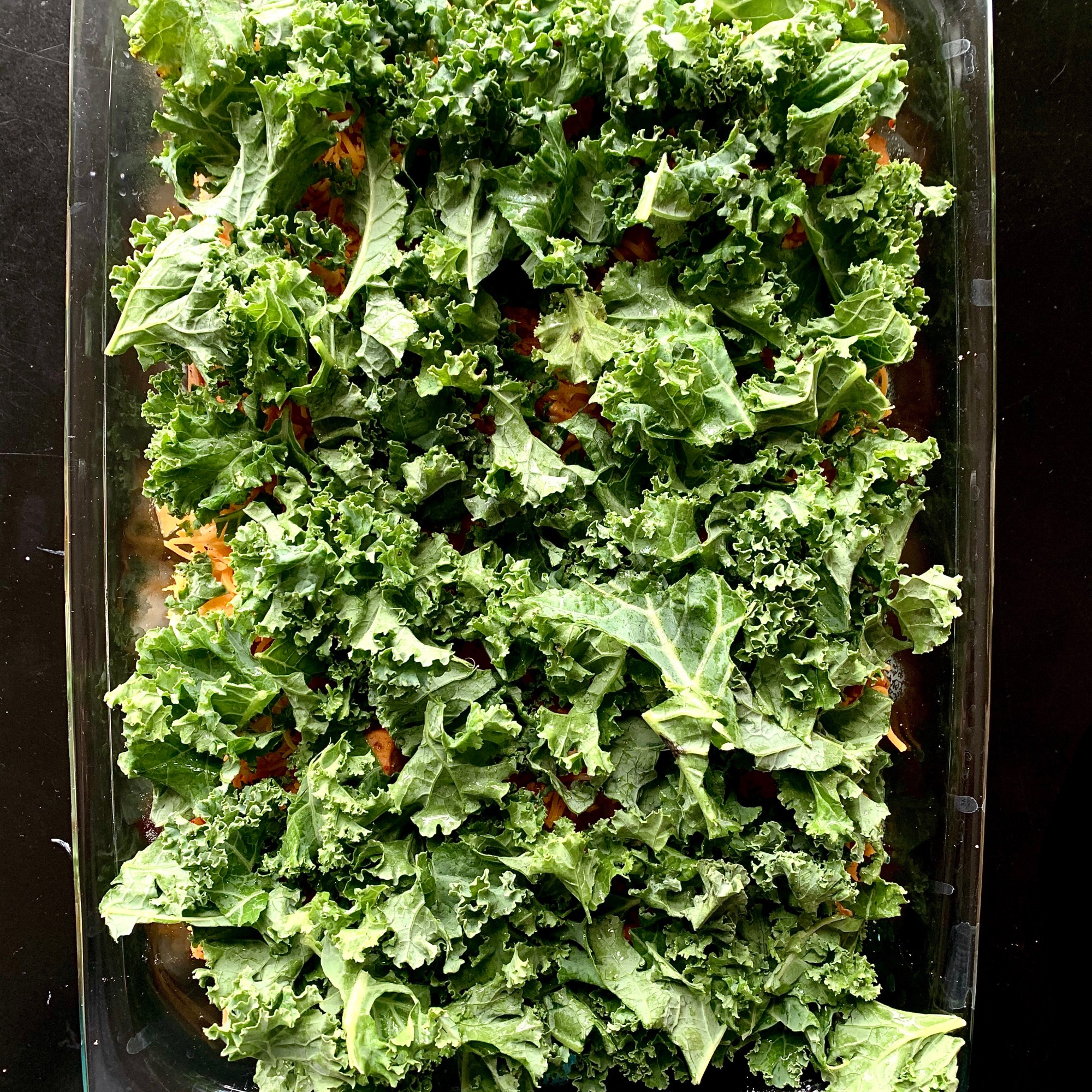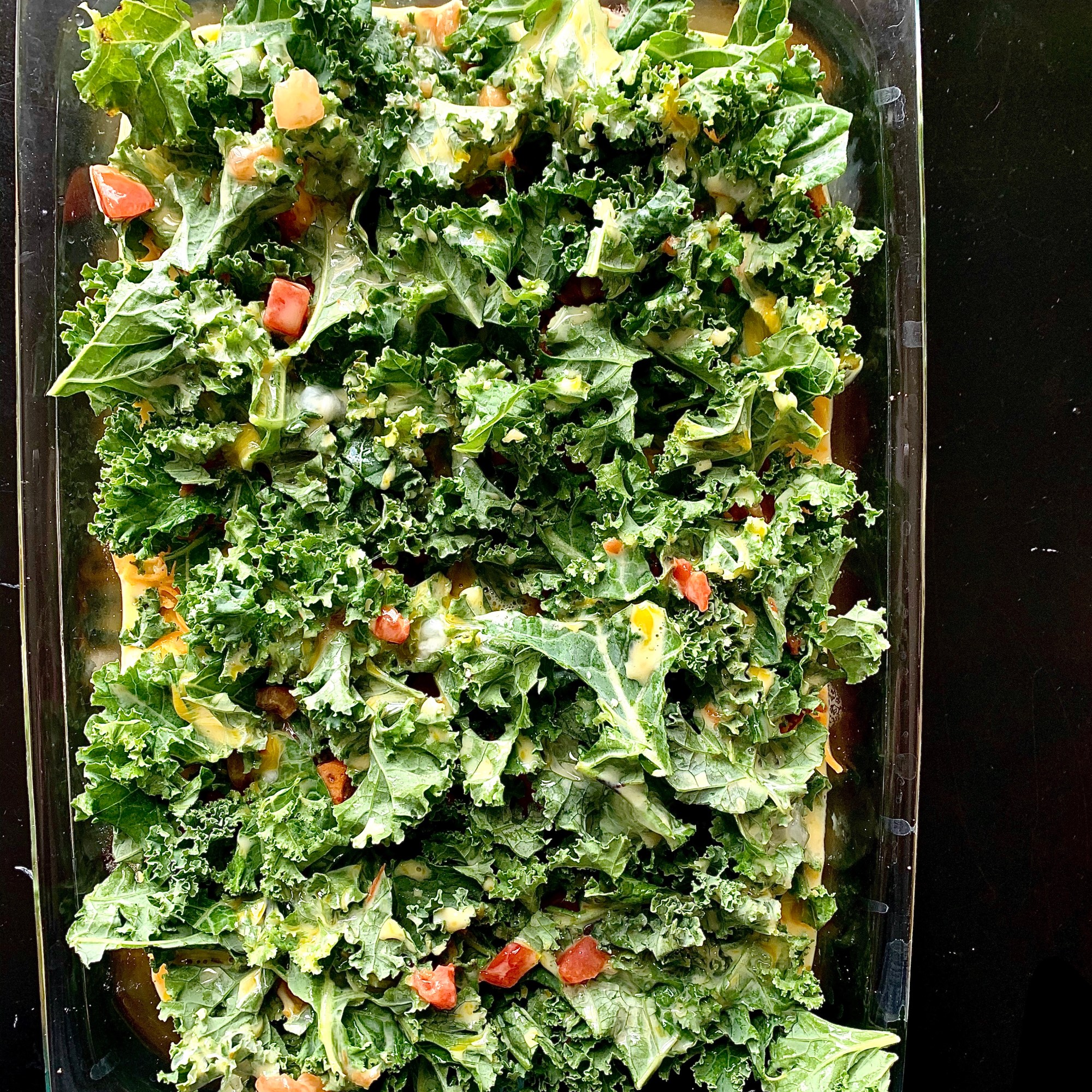- Place in the oven for 30-35 minutes. The casserole will be finished when the center is set. I generally wiggle the dish to check this. The kale will brown a bit on top, this is normal and tastes great!