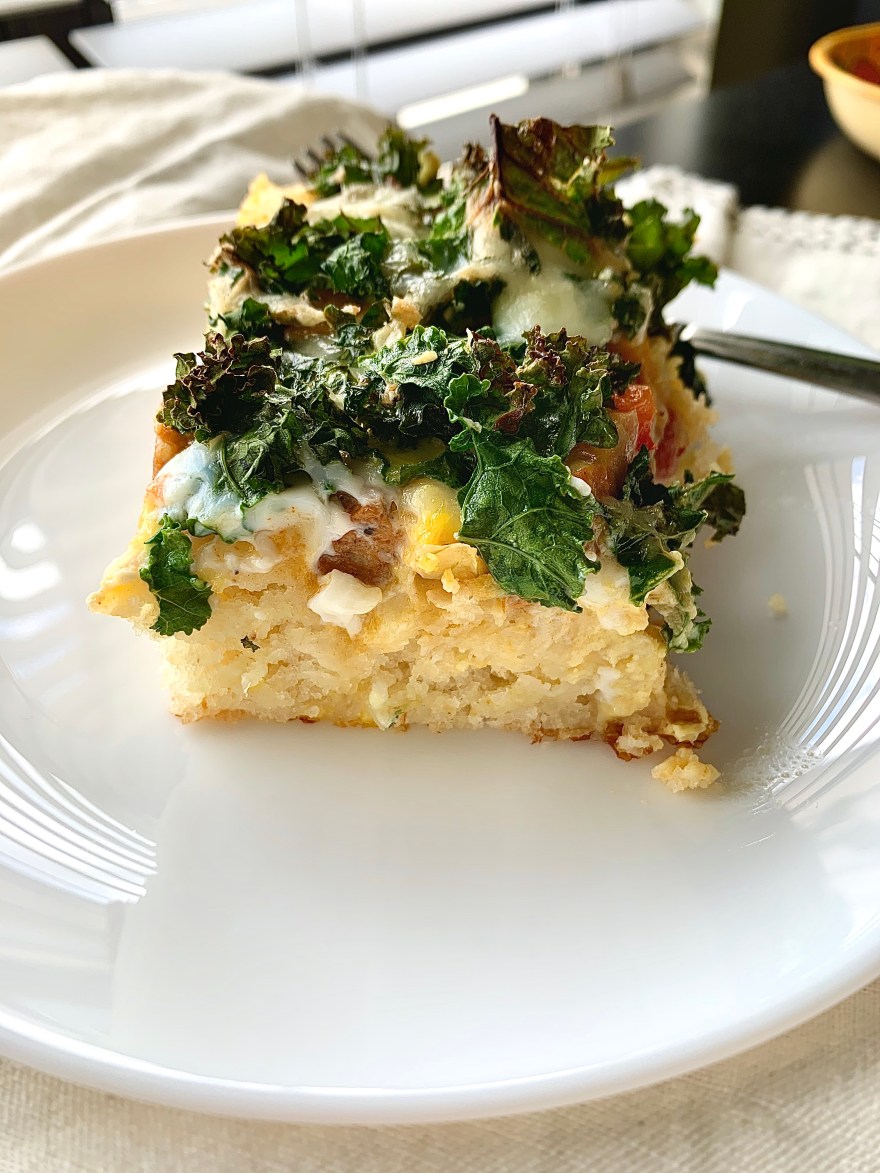 Really this is just a giant breakfast sandwich. It has all the components: bread, meat cheese, eggs and they come together like a big family and everyone plays their part. I love to add some hash additions such as sautéed bell peppers and onion. Also this is great for including veggies. We have a giant bag of kale we are trying to finish so that is pictured however I normally throw in baby spinach. I love the kale though because you get nice kale chips on top that have been kissed by white cheddar to create a tasty, crunchy combination. If you’ve never had kale chips before, this may be your initiation.